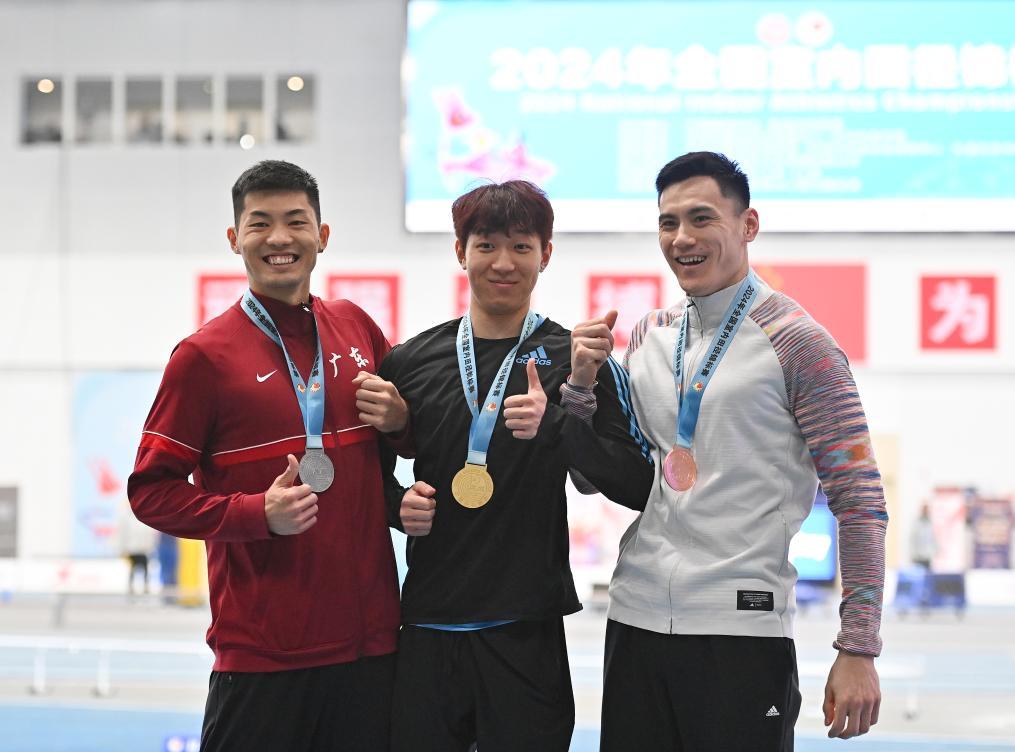 2024年3月29日,2024年全國室內田徑錦標賽男子撐桿跳高冠軍安徽隊選手鐘濤(中)、亞軍廣東隊選手黃博凱(左)、季軍山西隊選手姚捷在頒獎儀式上。新華社記者 宋彥樺 攝