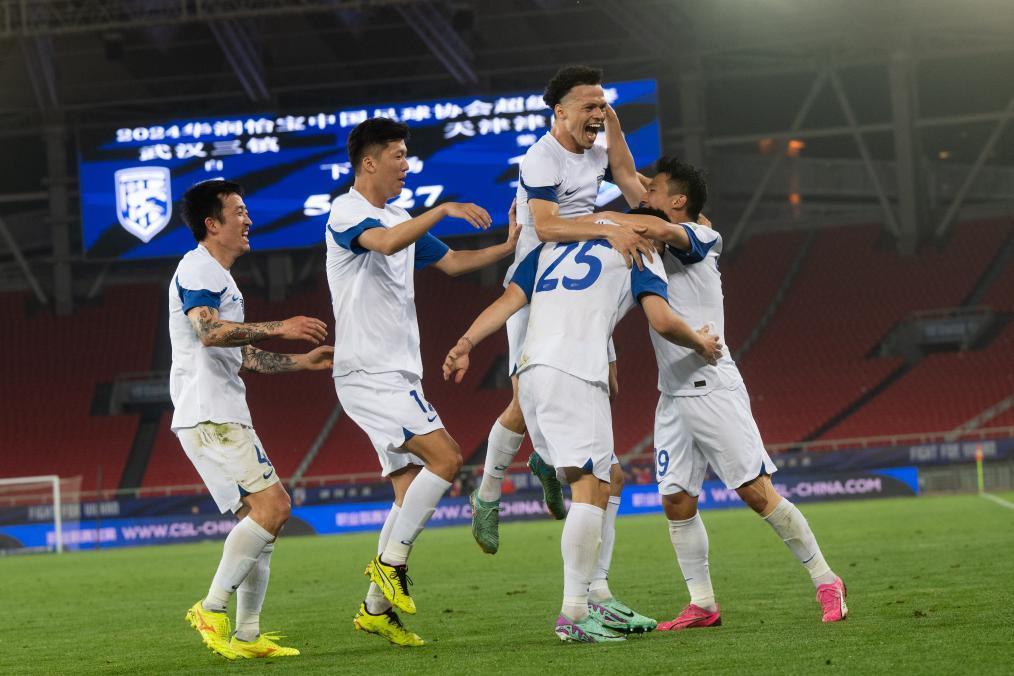 4月26日,武漢三鎮隊球員鄧涵文(右二)在進球后與隊友慶祝。新華社記者 肖藝九 攝