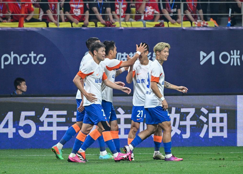 4月26日,山東泰山隊球員在比賽中慶祝進球。新華社記者 王曦 攝