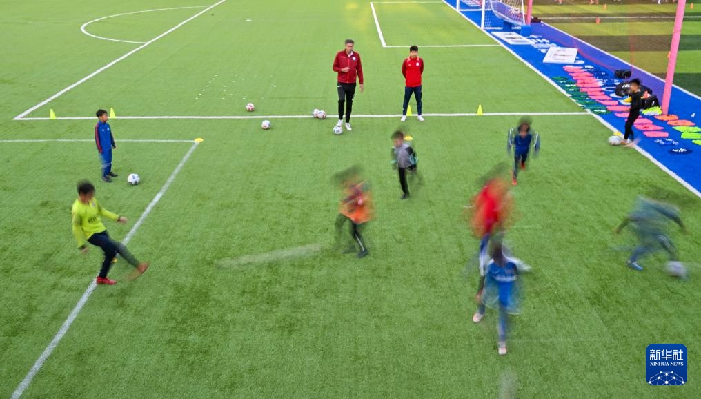 在天津市足協青訓基地,亞歷山大·潘蒂奇(上)在訓練中為小球員發放分組球衣(4月23日攝)。新華社記者 孫凡越 攝