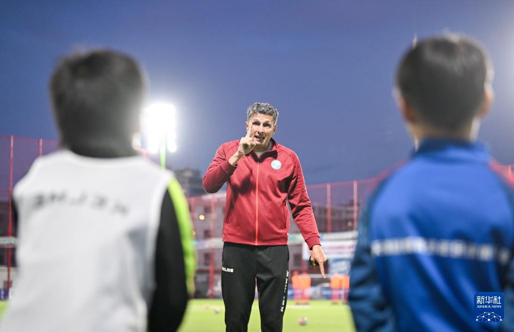 在天津市足協青訓基地,亞歷山大·潘蒂奇在訓練時鼓勵小球員(4月23日攝)。新華社記者 孫凡越 攝