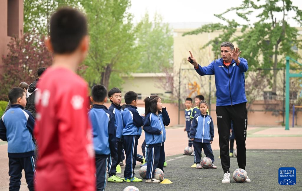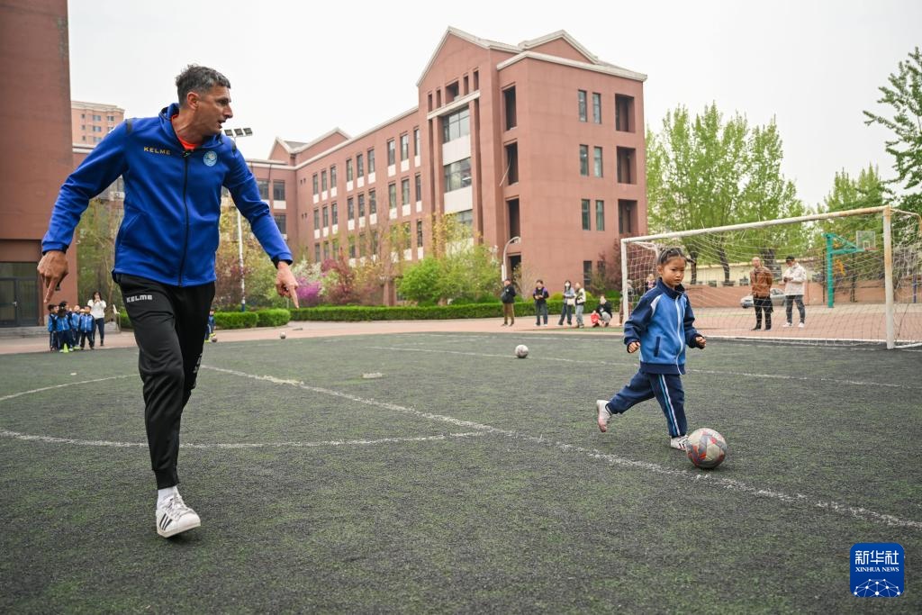 在天津外國語學校南普小學,亞歷山大·潘蒂奇(左)指導小球員(4月10日攝)。新華社記者 孫凡越 攝