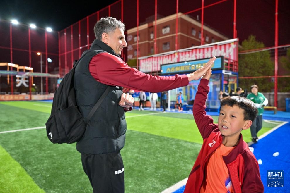 在天津市足協青訓基地,小球員在訓練結束后與亞歷山大·潘蒂奇(左)擊掌(4月23日攝)。新華社記者 孫凡越 攝