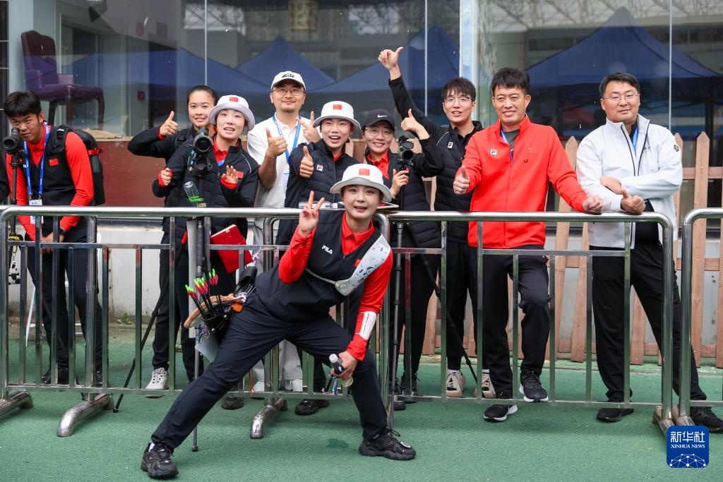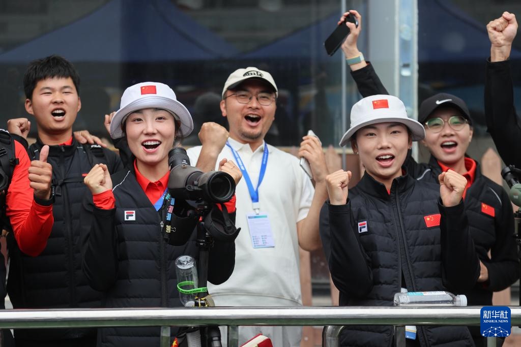 4月26日,隊(duì)友慶祝李佳蔓晉級(jí)女子反曲弓個(gè)人賽四強(qiáng)。新華社記者 王翔 攝