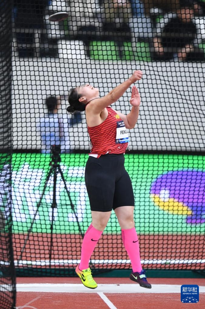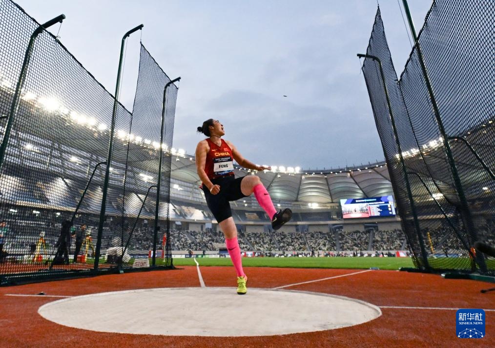 4月27日,中國選手馮彬在比賽中試投,她以67米11的成績獲得亞軍。新華社記者 宋彥樺 攝