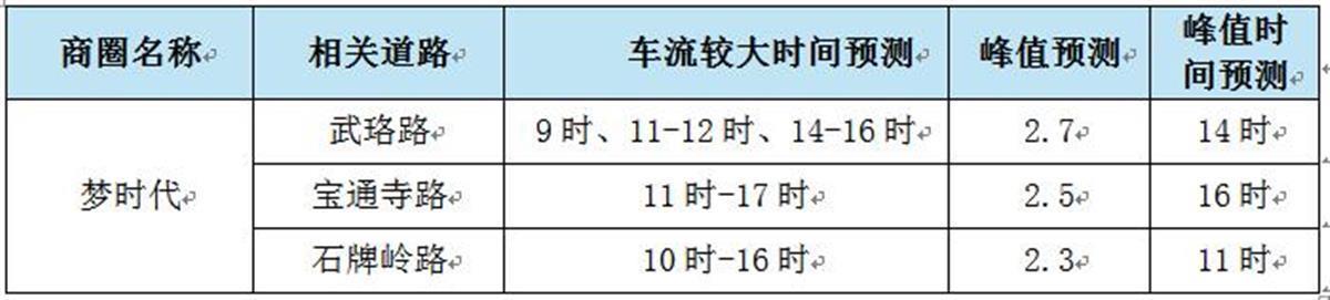 “五一”假期,商家開(kāi)展優(yōu)惠促銷活動(dòng),美食區(qū)域人氣旺盛,武昌交警預(yù)測(cè),武商夢(mèng)時(shí)代廣場(chǎng)以及附近中南商圈周邊的武珞路、中南路,每日9時(shí)、11時(shí)-12時(shí)、14時(shí)-16時(shí)車流量大,14時(shí)出現(xiàn)車流高峰;11時(shí)-17時(shí),寶通寺路車流較大,16時(shí)出現(xiàn)高峰;10時(shí)-16時(shí),石牌嶺路車流較大,11時(shí)出現(xiàn)高峰。