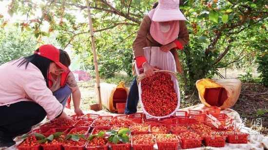 志愿者在櫻桃園里幫果農采摘整理豐收的果實。通訊員劉江 攝