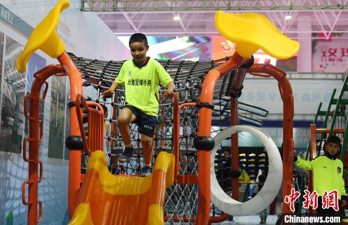 圖為一名足球“小將”體驗體育產品。中新網記者 孫亭文 攝