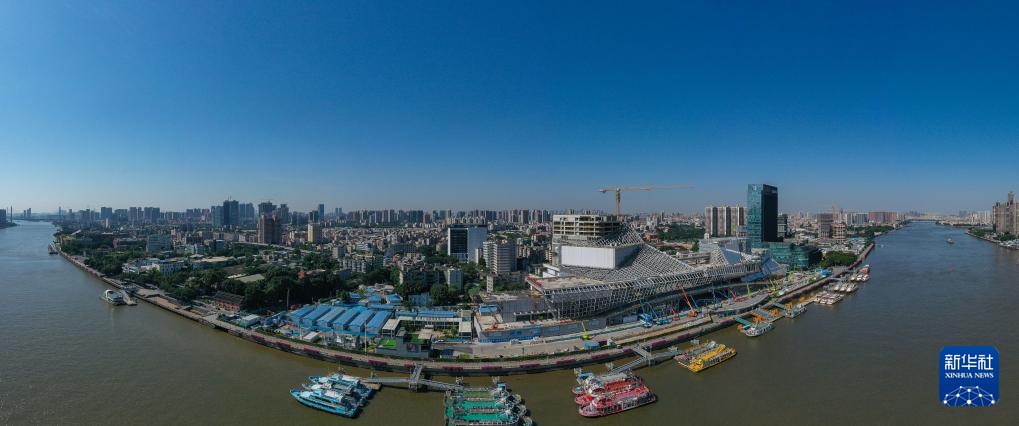 拼版照片:上圖為鋼結構施工階段的白鵝潭大灣區藝術中心(新華社發,2022年7月21日攝);下圖為即將竣工的白鵝潭大灣區藝術中心(新華社記者劉大偉2023年12月27日攝)。