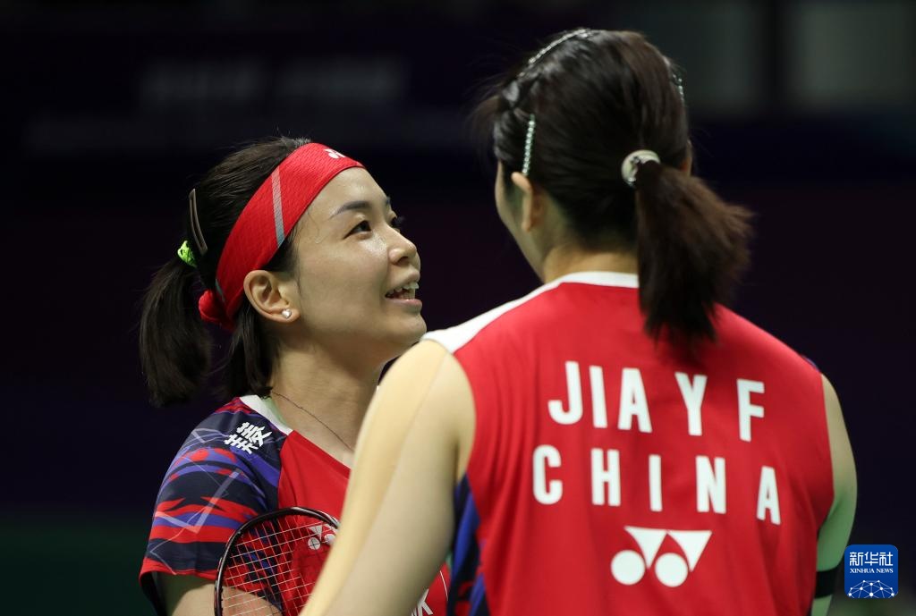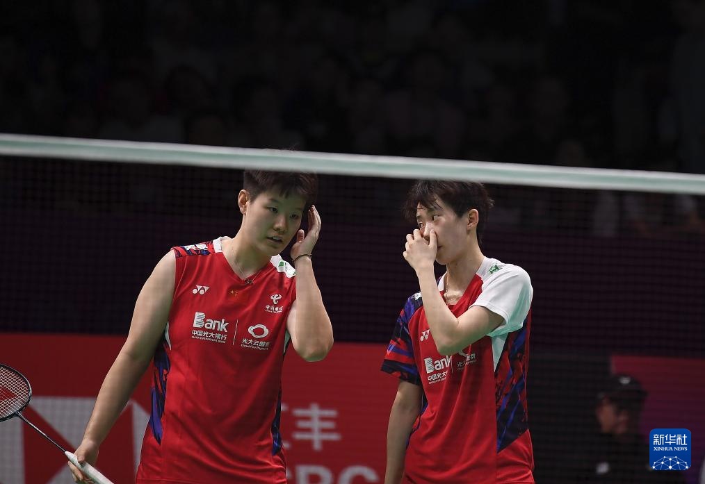 4月28日,中國隊(duì)組合劉圣書(左)/張殊賢在女雙比賽中交流。她們2比0戰(zhàn)勝加拿大隊(duì)組合杰斯林·周/埃莉安娜·張。新華社記者 侯昭康 攝