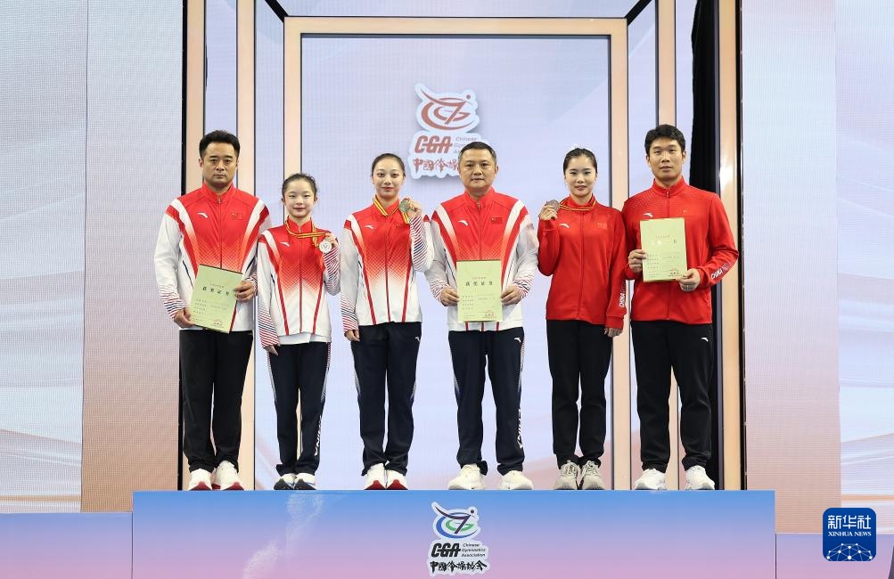 4月28日,亞軍河南隊選手張怡涵(左二)與教練程繼偉(左一)、冠軍福建隊選手虞琳敏(左三)與教練劉濤(右三)、季軍江西隊選手葉丹丹(右二)與教練蔡飛達在頒獎儀式上合影。新華社記者曹燦攝