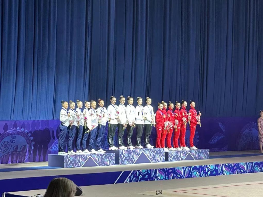 在集體全能比拼中,由郭崎琪、郝婷、黃張嘉洋、王瀾靜、丁欣怡組成的中國藝術(shù)體操隊(duì)集體組在5圈項(xiàng)目上得到36.05分,3帶2球得到33.05分,以總分69.10分奪金,比第二名法國隊(duì)高出3.85分。在5圈單項(xiàng)決賽中,中國隊(duì)發(fā)揮更加出色,新成套《共生共舞》得到了國際裁判的認(rèn)可,拿下38.30的高分冠絕全場,再奪一金。波蘭、德國隊(duì)分列第二、三名。3帶2球單項(xiàng)決賽中,中國隊(duì)以29.80分獲得第四名。法國、烏茲別克斯坦、波蘭隊(duì)分別獲得前三名。
