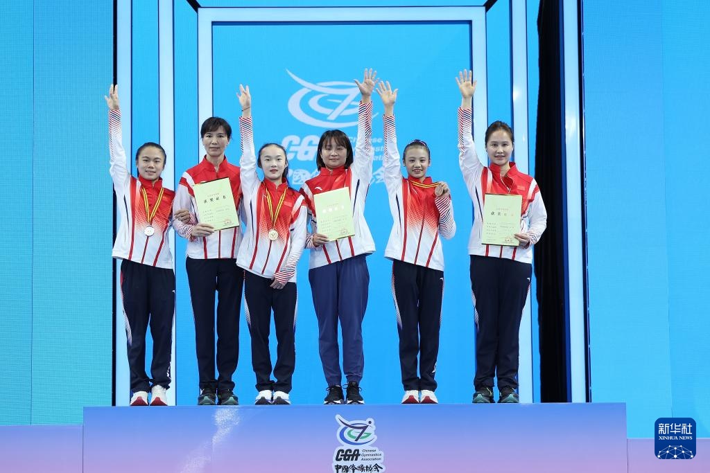 4月29日,冠軍湖南隊選手周雅琴(左三)與教練何花(右三)、亞軍浙江隊選手張清穎(左一)與教練徐驚雷(左二)、季軍福建隊選手邱祺緣(右二)與教練孫萍在頒獎儀式上合影。新華社記者 曹燦 攝