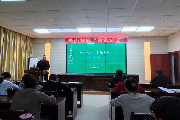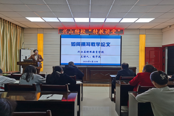 荊楚網(湖北日報網)訊(通訊員 黃華新)4月10日晚,興山特?!疤亟讨v堂”精彩開講。全國特教園丁、宜昌名師李軍堂、胡平先登上講堂,分別以《以文化人 來“趣”自“入”——教師寫作能力趣談》《如何撰寫教學論文》為題,為全校教師專業成長傳經送寶。
