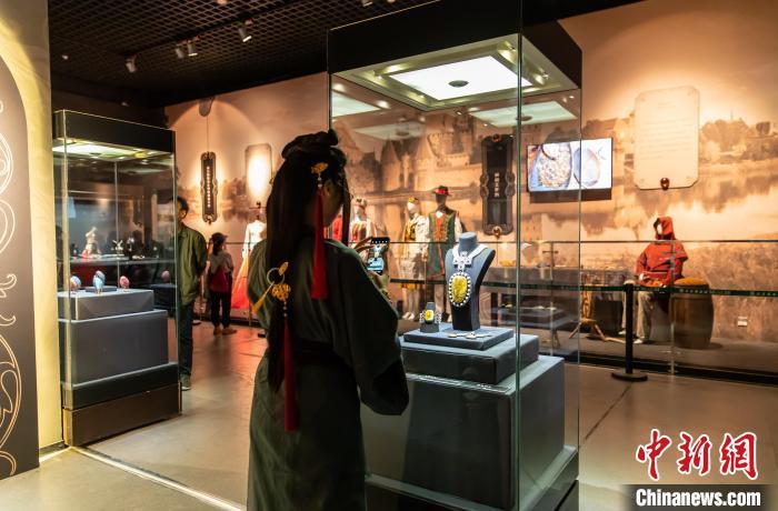 4月30日,“瞬間與永恒——波蘭琥珀文化藝術展”在天津博物館開展。圖為身穿漢服的唐山游客李靖怡參展。 王在御 攝