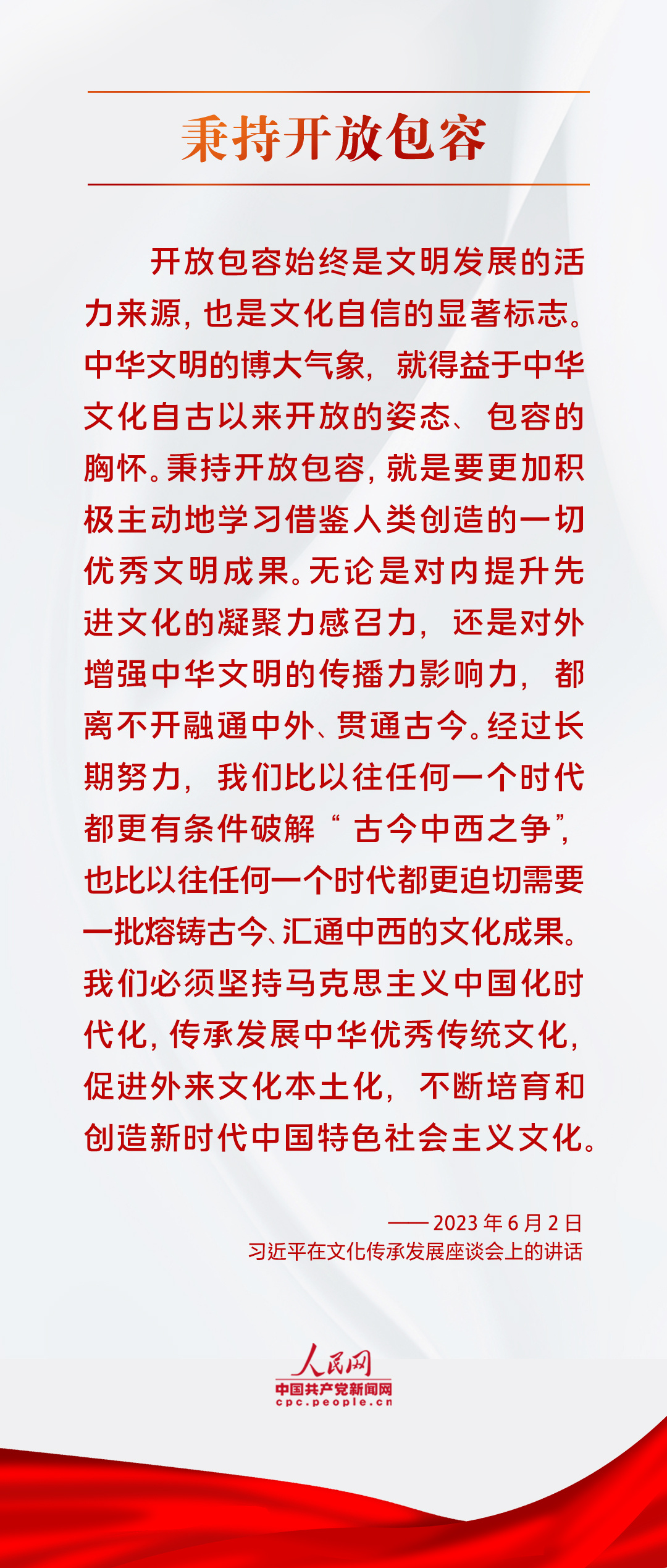 更好擔負起新的文化使命,就要秉持開放包容。習近平總書記指出:“中華文明自古就以開放包容聞名于世,在同其他文明的交流互鑒中不斷煥發新的生命力。”中華文明在長期演進過程中,創造了博大精深的優秀傳統文化,也鑄就了博采眾長的文化自信。中華文化既是歷史的、也是當代的,既是民族的、也是世界的。今天,我們要鑄就中華文化新輝煌,就要以更加博大的胸懷,更加廣泛地開展同各國的文化交流,更加積極主動地學習借鑒世界一切優秀文明成果。新征程上,要秉持開放包容,堅持馬克思主義中國化時代化,傳承發展中華優秀傳統文化,堅持不忘本來、吸收外來、面向未來,在繼承中轉化,在學習中超越,促進外來文化本土化,不斷培育和創造新時代中國特色社會主義文化。——《人民日報》