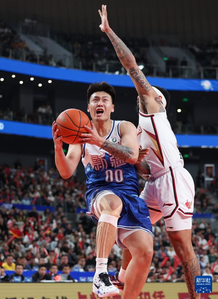 5月2日,新疆伊力特隊球員趙睿(左)在比賽中突破上籃。新華社記者 胡虎虎 攝