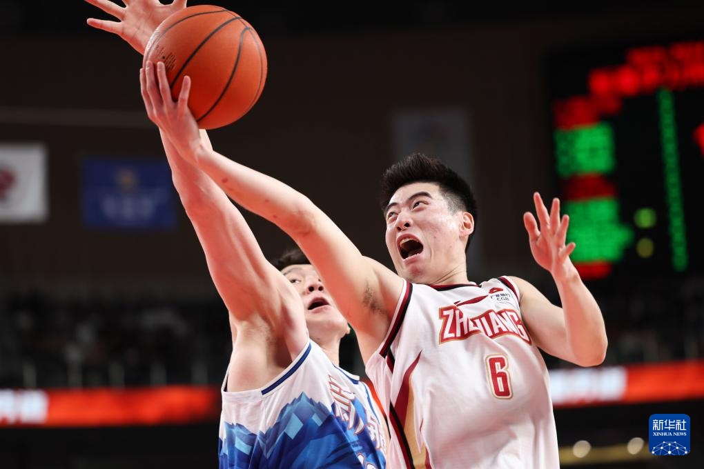 5月2日,浙江稠州金租隊球員程帥澎(右)在比賽中投籃。新華社記者 胡虎虎 攝