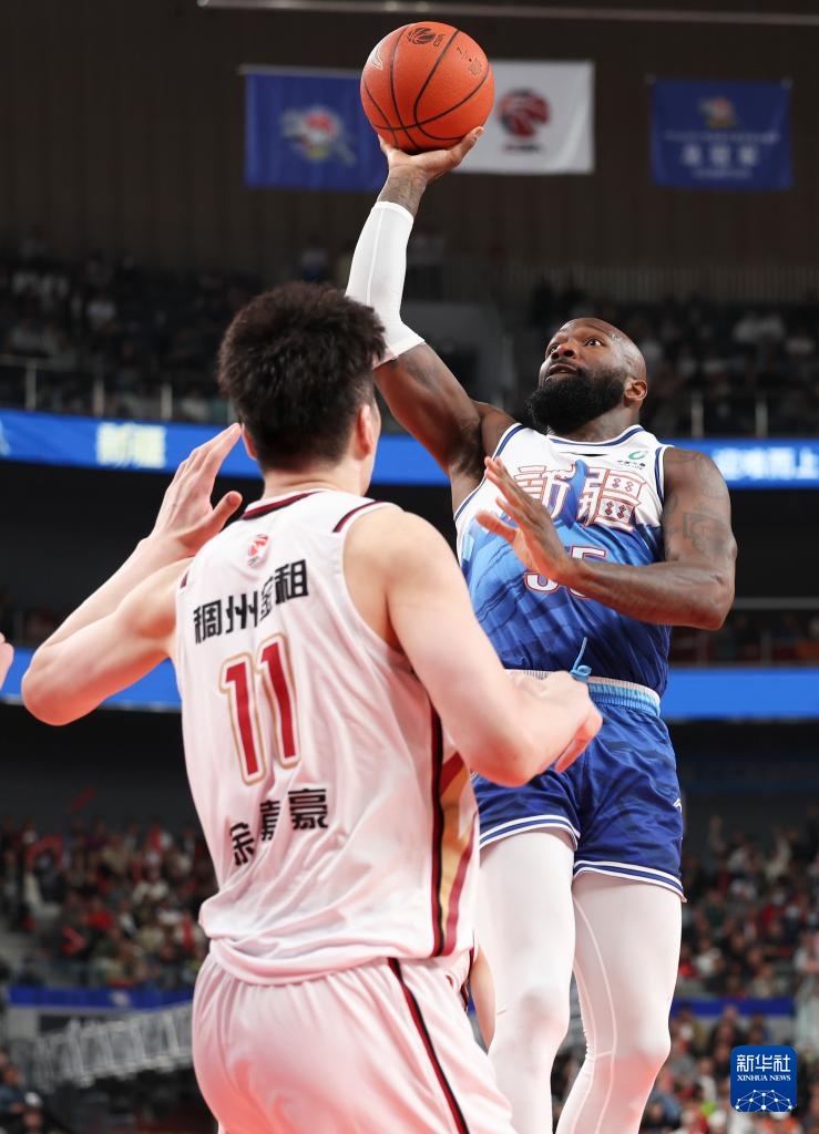 5月2日,新疆伊力特隊球員瓊斯(右)在浙江稠州金租隊球員余嘉豪的防守下投籃。新華社記者 胡虎虎 攝