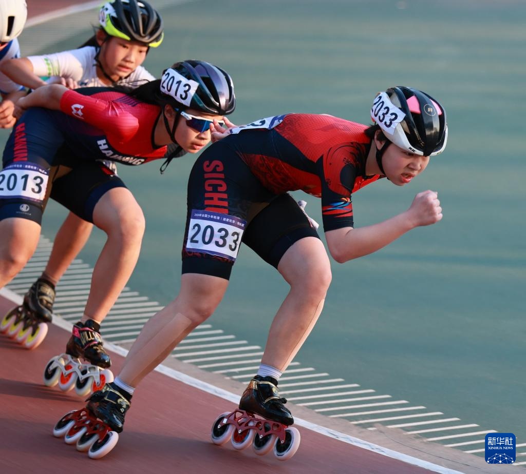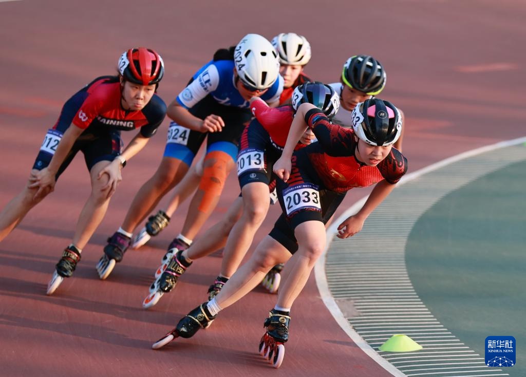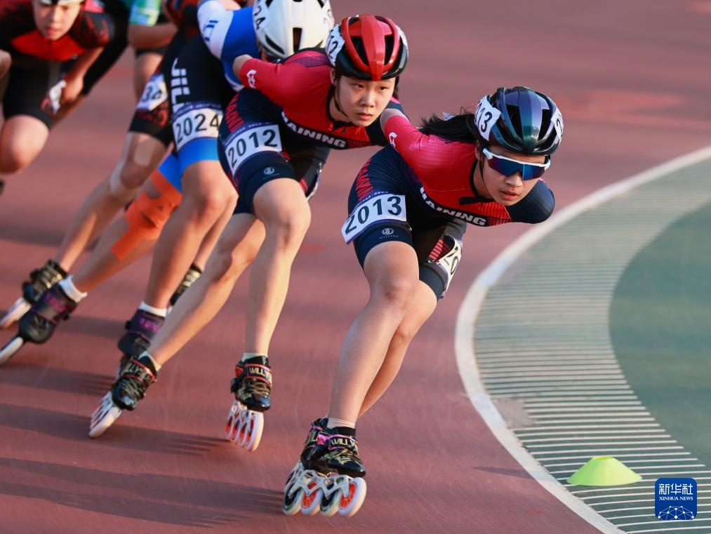 5月2日,四川省速度輪滑隊選手李沛諭(右一)在女子甲組10000米淘汰賽比賽中。最終,她以18分15秒475的成績獲得季軍。新華社記者 楊世堯 攝