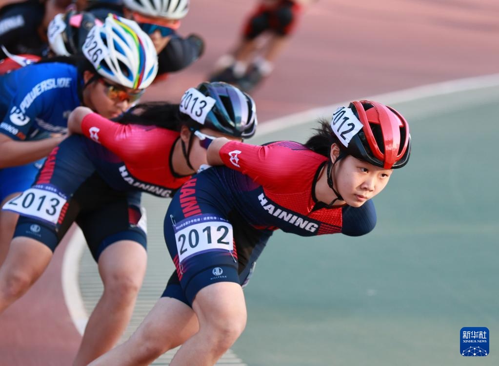 5月2日,海寧速度輪滑一隊選手王璐瑤(左二)在女子甲組10000米淘汰賽比賽中。最終,她以18分08秒901的成績奪得冠軍。