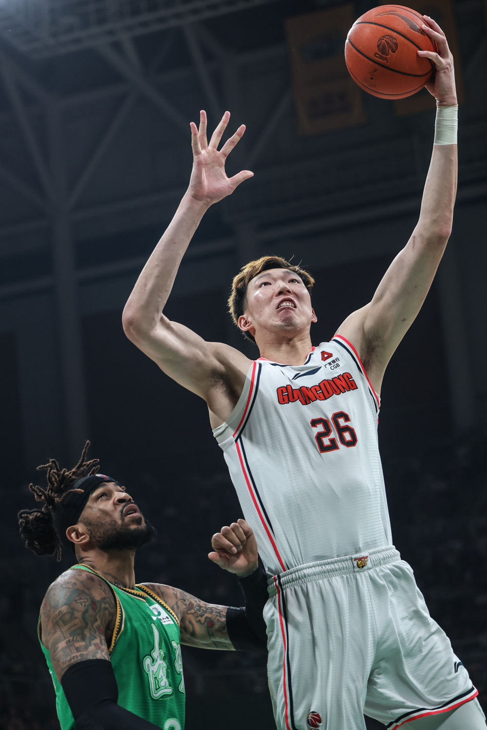 5月3日,廣東隊球員周琦(右)在比賽中上籃。新華社記者 潘昱龍 攝