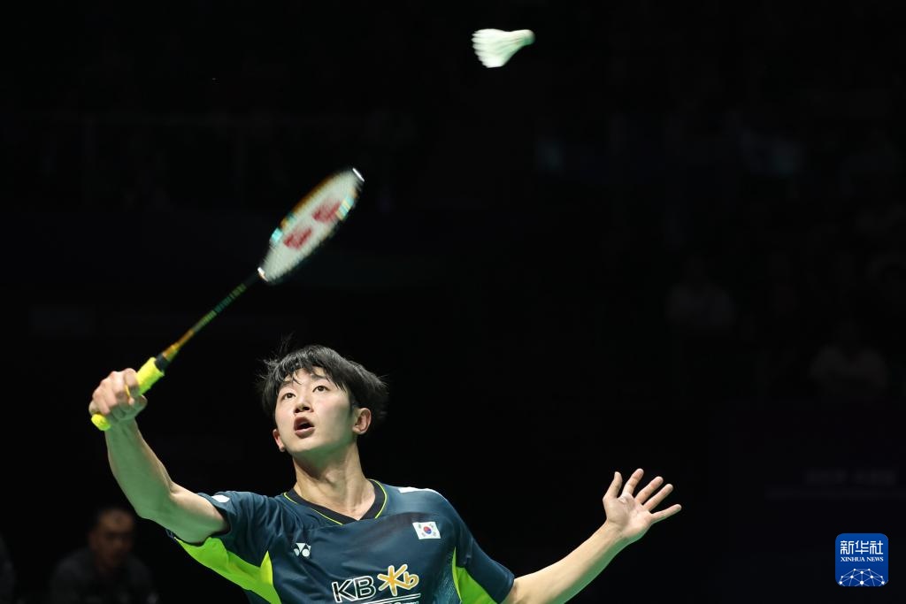 5月3日,韓國隊選手趙建曄在男單比賽中回球。他1比2不敵印度尼西亞隊選手喬納坦。新華社記者 侯昭康 攝