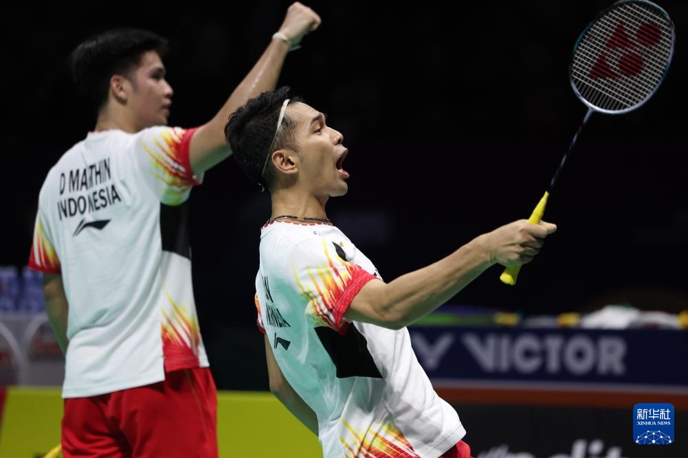 5月3日,印度尼西亞隊組合阿爾菲安(右)/馬丁在男雙比賽獲勝后慶祝。他們2比0戰(zhàn)勝韓國隊組合奇東柱/金元昊。新華社記者 陳斌 攝
