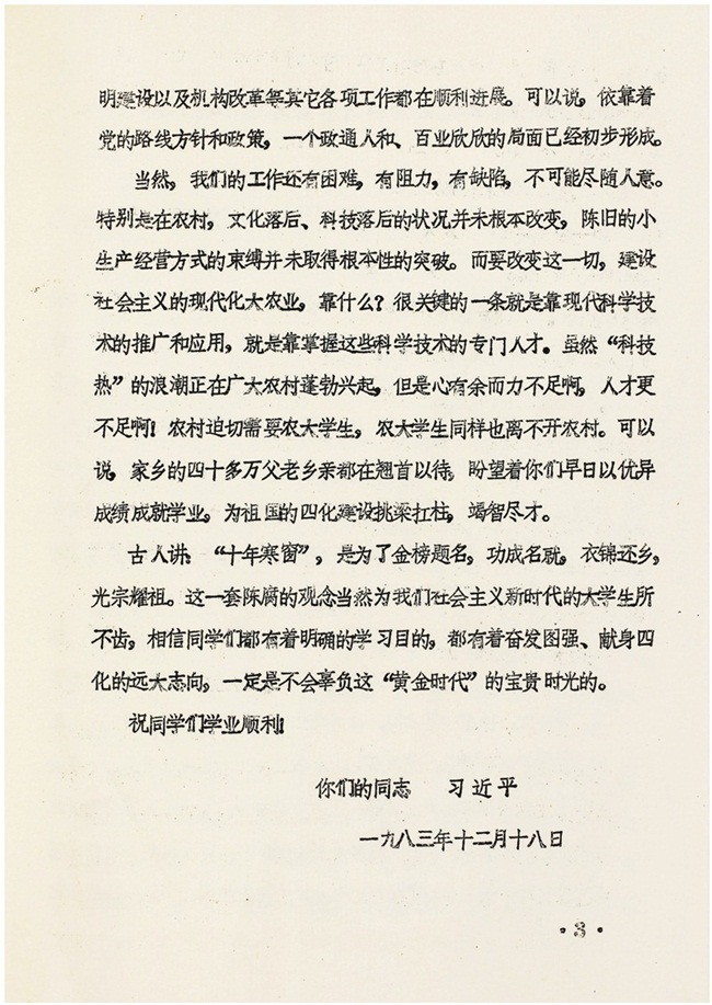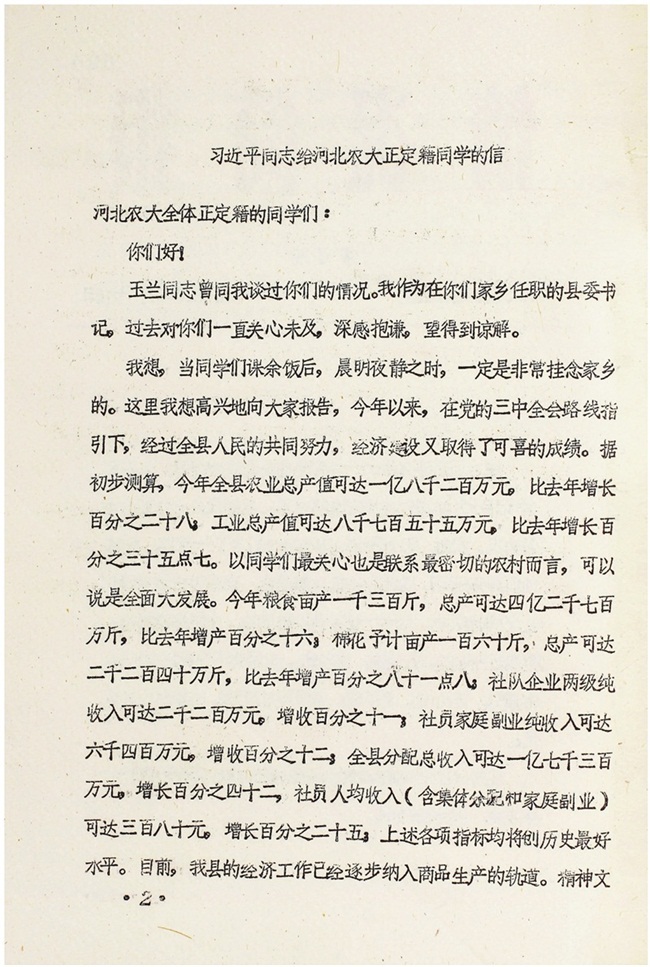 1983年,習近平寫給河北農大全體正定籍學生的信。圖源:《習近平在正定》