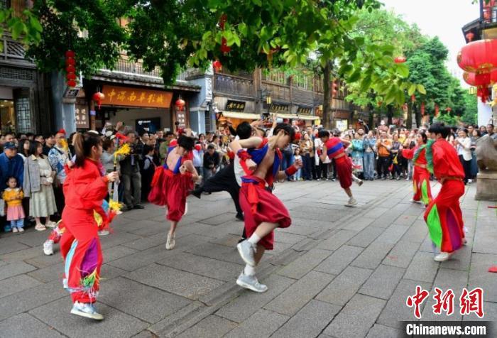 5月1日,游客在福州三坊七巷觀看拍胸舞表演。中新網記者張斌攝