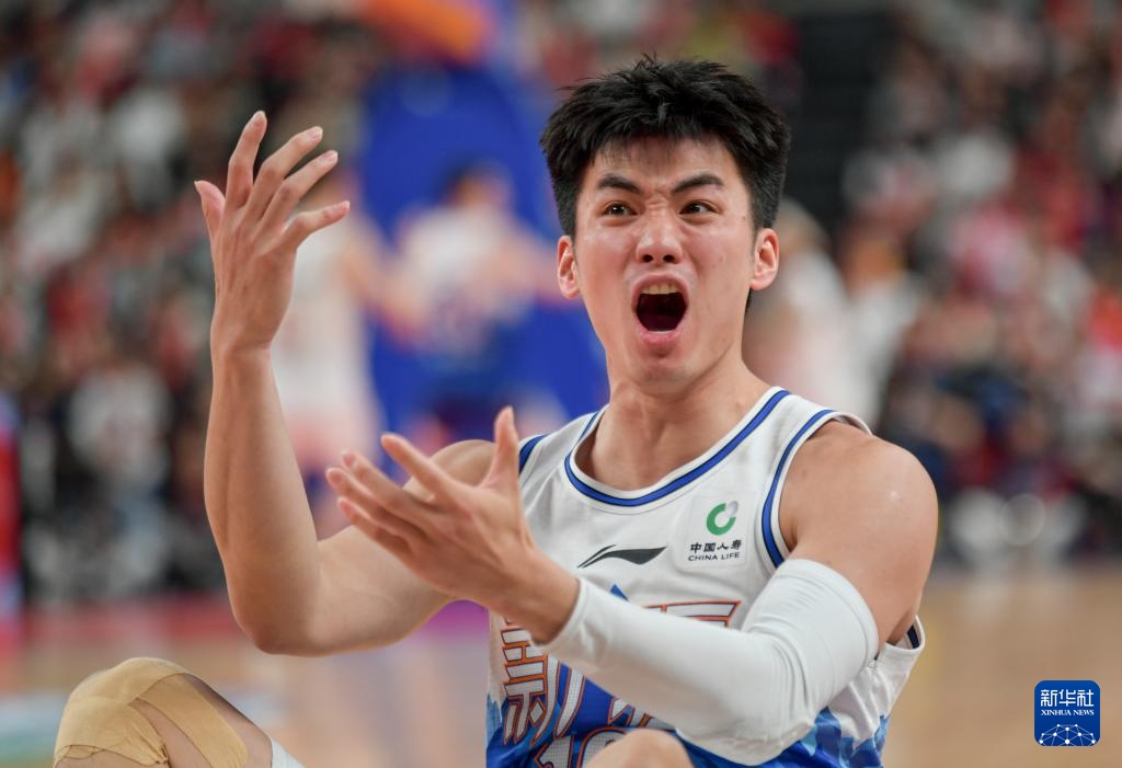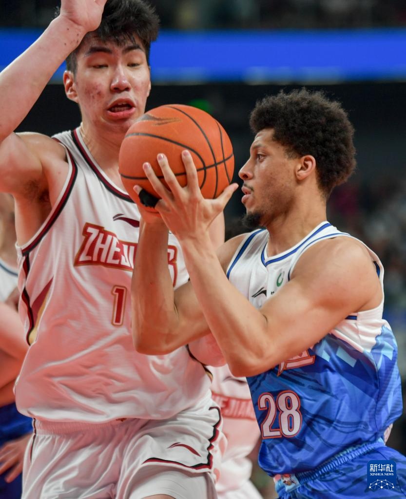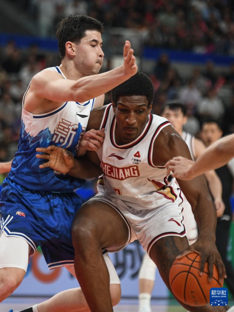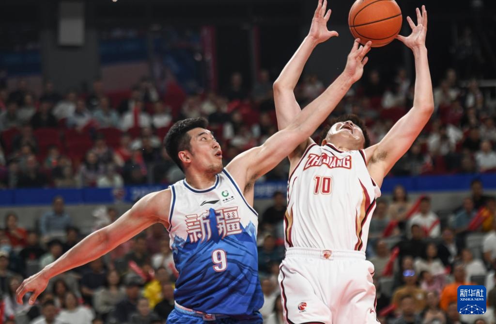 5月4日,浙江稠州金租隊球員余嘉豪(左)在新疆伊力特隊球員李炎哲的防守下進攻。新華社記者 王菲 攝
