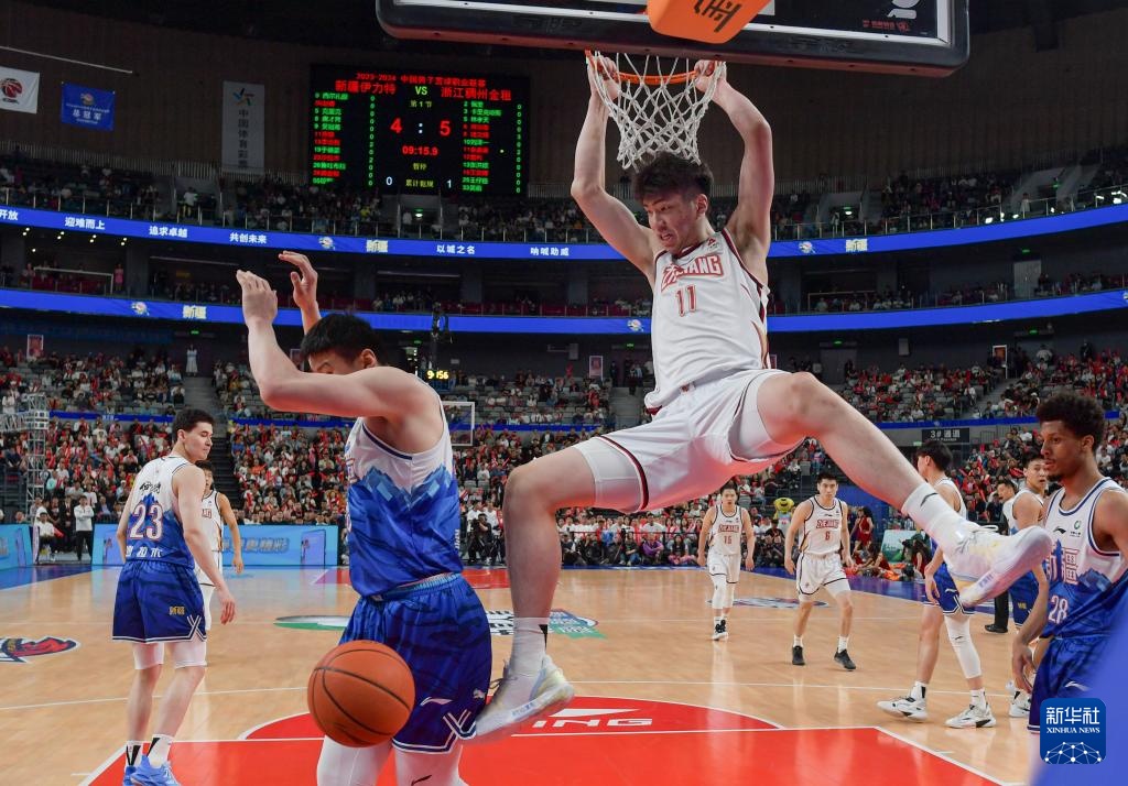 5月4日,浙江稠州金租隊球員余嘉豪(上)在比賽中扣籃。新華社記者 王菲 攝