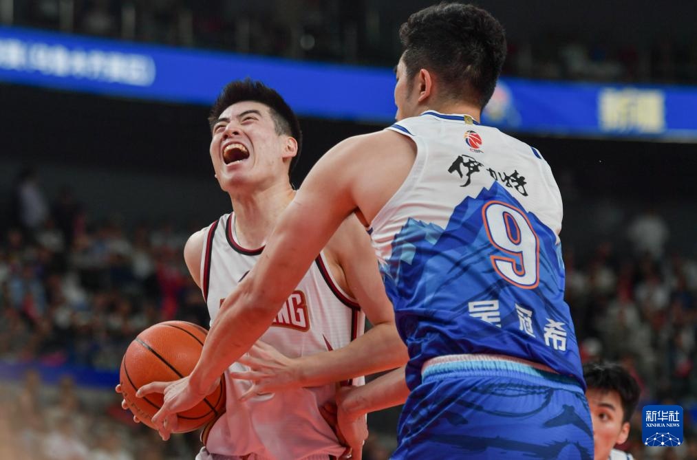 5月4日,新疆伊力特隊球員吳冠希(左)與浙江稠州金租隊球員劉澤一爭搶籃板球。新華社記者 王菲 攝