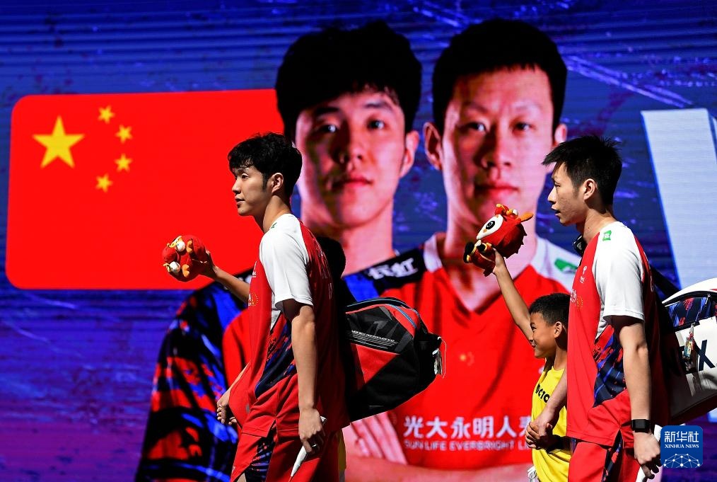 5月4日,中國隊組合何濟(jì)霆(左)/任翔宇在男子雙打比賽前入場。他們2比1戰(zhàn)勝馬來西亞隊組合吳世飛/努·伊祖丁。新華社記者 侯昭康 攝