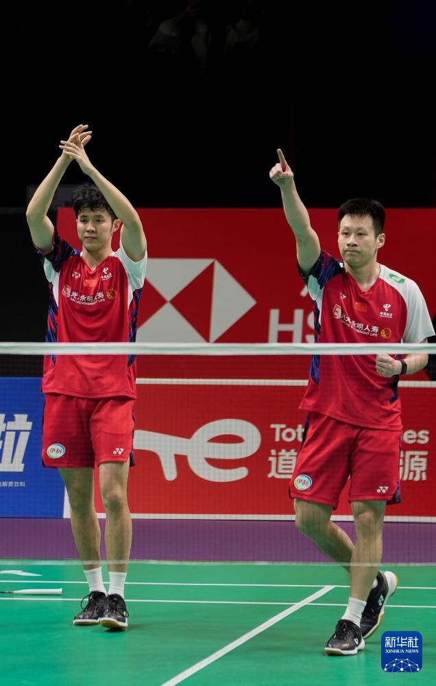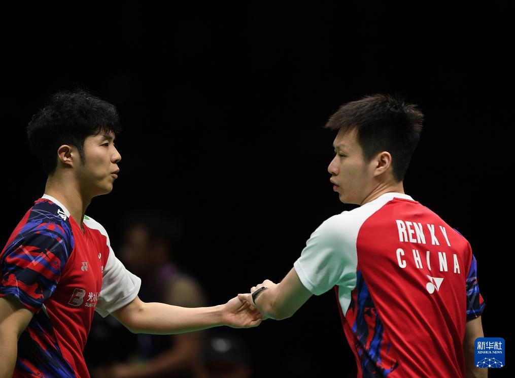5月4日,中國隊組合何濟(jì)霆/任翔宇(右)在男子雙打比賽中。他們2比1戰(zhàn)勝馬來西亞隊組合吳世飛/努·伊祖丁。新華社記者 侯昭康 攝