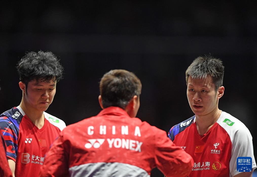 5月4日,中國隊組合何濟(jì)霆(左)/任翔宇(右)在男子雙打比賽間隙接受教練指導(dǎo)。他們2比1戰(zhàn)勝馬來西亞隊組合吳世飛/努·伊祖丁。新華社記者 侯昭康 攝