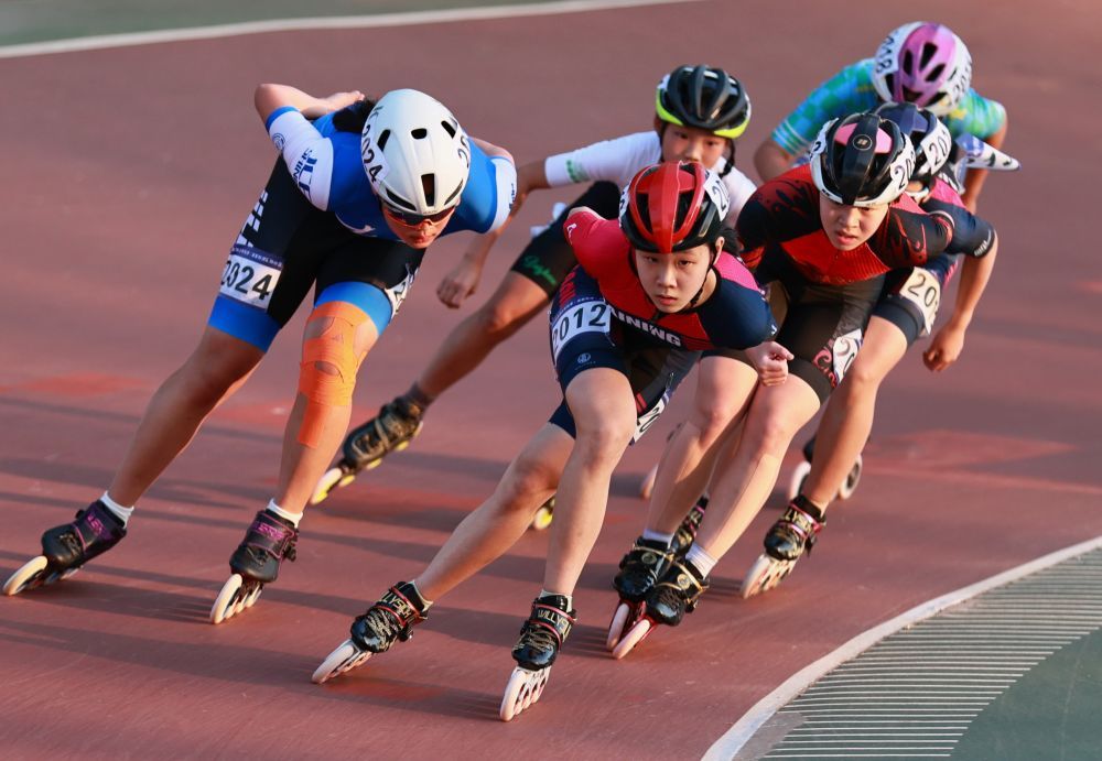 海寧速度輪滑一隊選手王璐瑤(左二)在女子甲組10000米淘汰賽比賽中奪得冠軍。新華社記者 楊世堯 攝