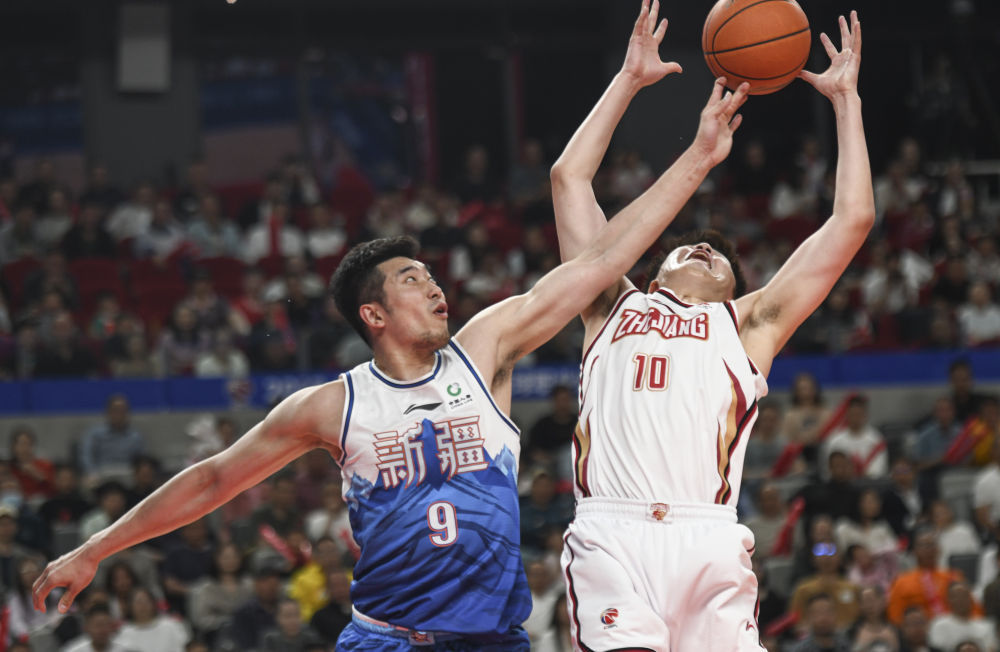 5月4日,新疆隊球員吳冠希(左)與浙江隊球員劉澤一爭搶籃板球。新華社記者 王菲 攝