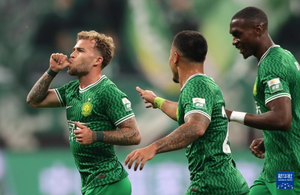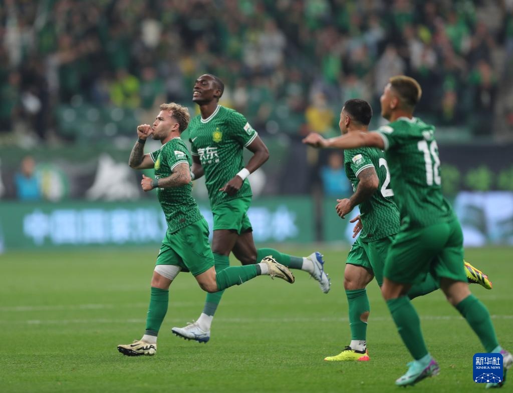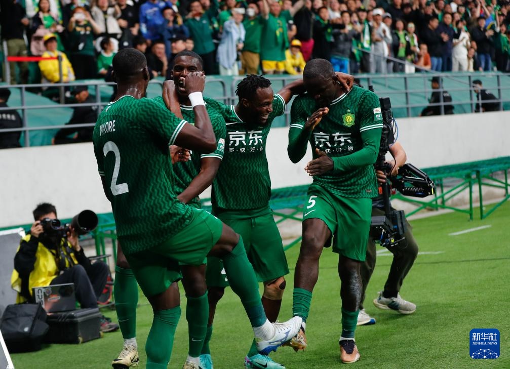 5月5日,北京國安隊球員古加(左一)進球后慶祝。新華社記者 胡星宇 攝