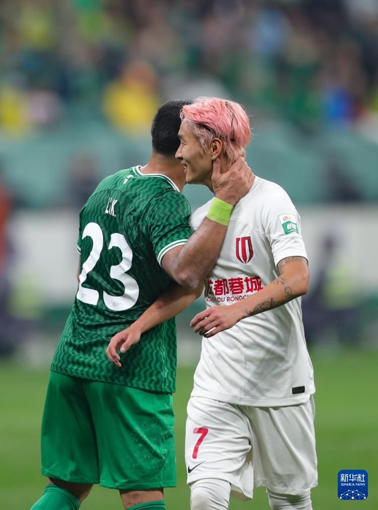 5月5日,成都蓉城隊球員費利佩(上)在比賽中爭頂。新華社記者 張晨霖 攝