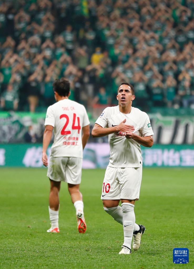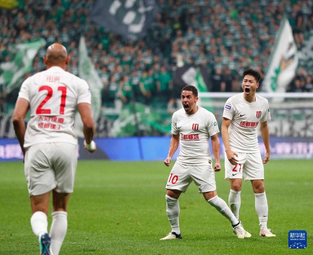 5月5日,成都蓉城隊球員羅慕洛(右)進球后慶祝。新華社記者 胡星宇 攝