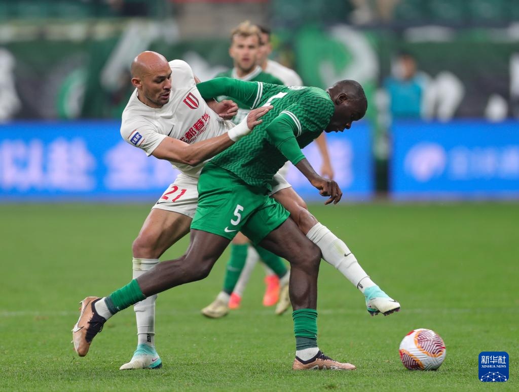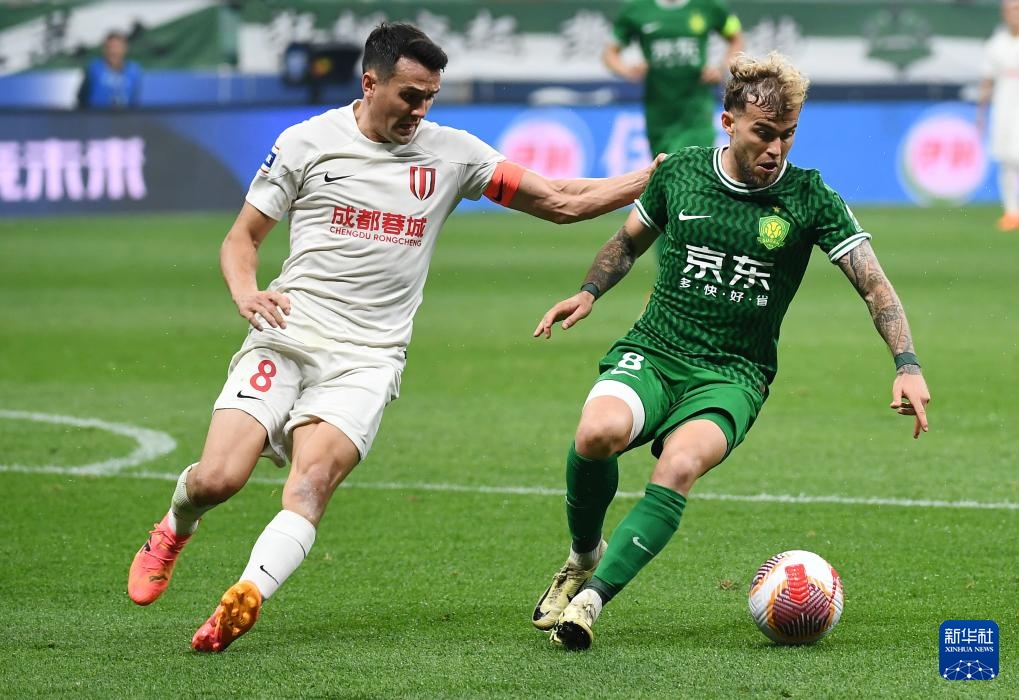 5月5日,北京國安隊球員恩加德烏(右)和成都蓉城隊球員費利佩在比賽中拼搶。新華社記者 胡星宇 攝