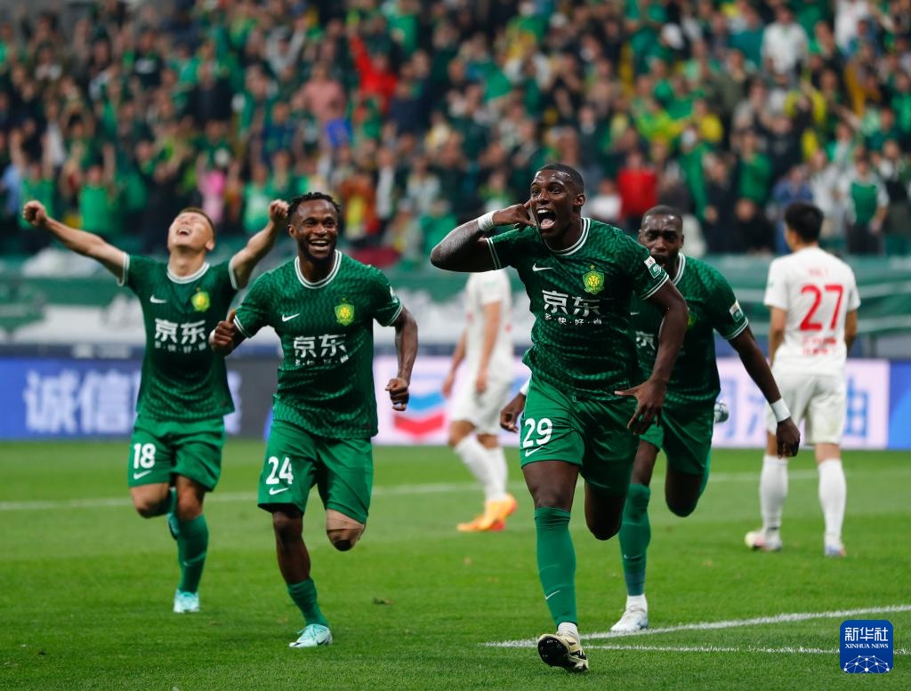 5月5日,北京國安隊球員古加(前,左一)在比賽中慶祝進球。新華社記者 張晨霖 攝