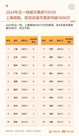 報告顯示,城市票房排行榜中,上海票房以6907萬元位列榜首,前4名城市票房破5000萬元。
