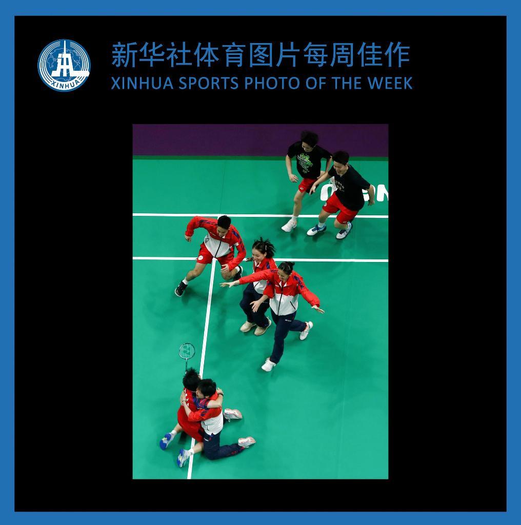 5月5日,中國隊(duì)選手何冰嬌(下左)在女子單打比賽獲勝后與隊(duì)友慶祝。何冰嬌2比1戰(zhàn)勝印度尼西亞隊(duì)選手瓦多約。
