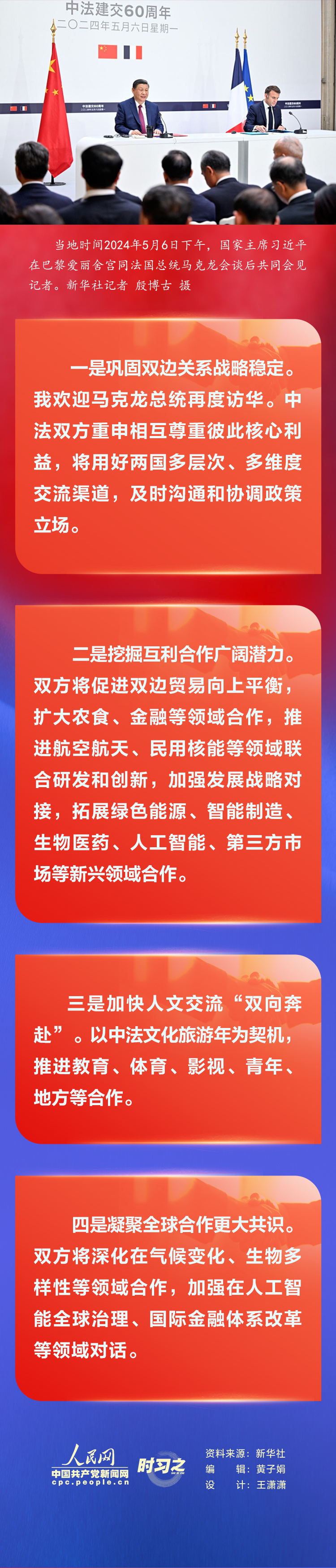 當地時間2024年5月6日下午,國家主席習近平在巴黎愛麗舍宮同法國總統馬克龍會談后共同會見記者。習近平指出,很高興應馬克龍總統邀請,在中法建交60周年之際,再次對法國進行國事訪問。我同馬克龍總統舉行了富有成果的會談。我們一致認為,中法關系具有珍貴歷史、獨特價值和重要使命,雙方要傳好歷史的接力棒,弘揚中法建交精神并為其賦予新的時代內涵,開啟中法關系下一個60年的新征程。