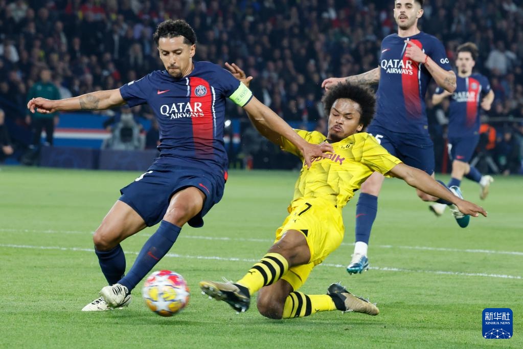 5月7日,巴黎圣日耳曼隊球員馬爾基尼奧斯(左)與多特蒙德隊球員阿德耶米在比賽中拼搶。新華社發(亨利·斯瓦里克攝)