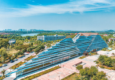 湖北武漢西南部,馬鞍山與后官湖的綠水青山之間,坐落著一棟整體造型宛如山丘的銀白色建筑。層疊有致的玻璃幕墻,仿佛波浪般連綿起伏,與周圍山水風(fēng)光融為一體。