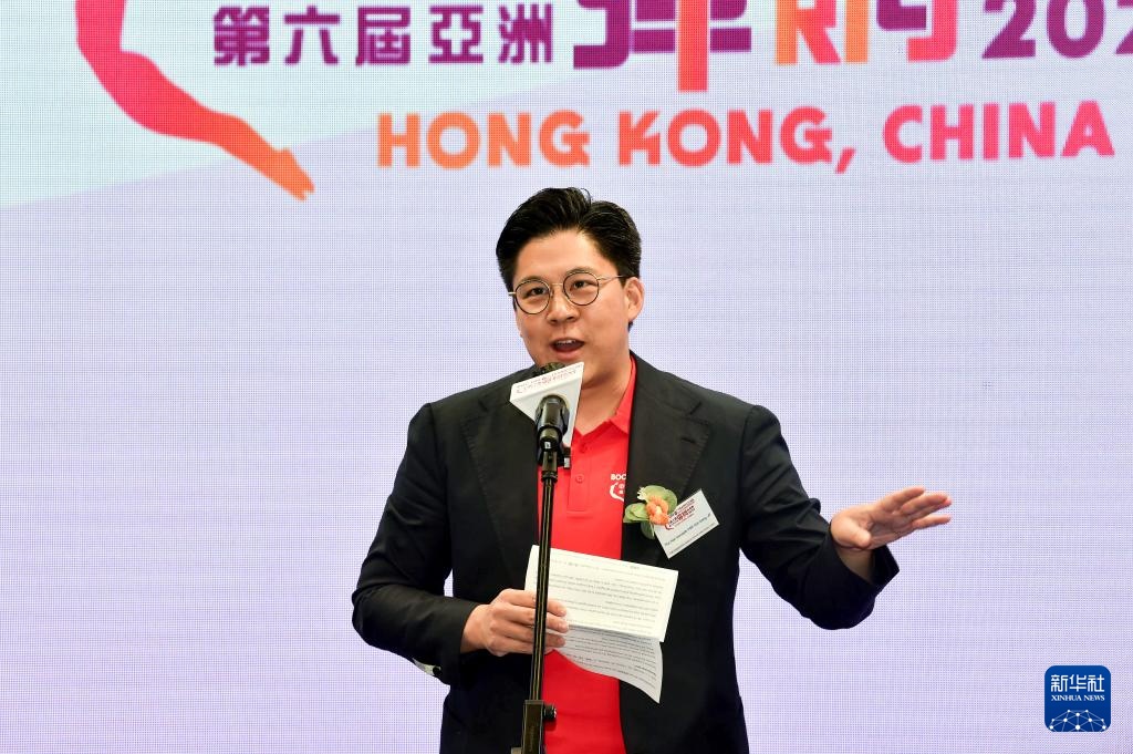 5月10日,中國(guó)香港體操總會(huì)會(huì)長(zhǎng)霍啟剛在新聞發(fā)布會(huì)上致辭。新華社記者 盧炳輝 攝