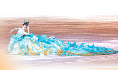 楚艷介紹,長裙整體造型采用了西式大禮服的廓形,上衣收腰、束身更便于展現演員的舞姿,而裙體中還點綴有3D復合工藝制作的亭臺樓閣和樹木紋樣。“以中國傳統文化為內核,以時代創新精神為風貌,傳統美學融入當代時尚的方式,讓藝術呈現有更寬廣的可能性。”